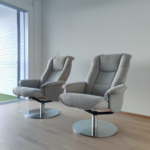 Ylimääräiseksi jäänyt tanskalainen design nojatuoli (Hjort Knudsen). Vaaleanharmaa väriltään.