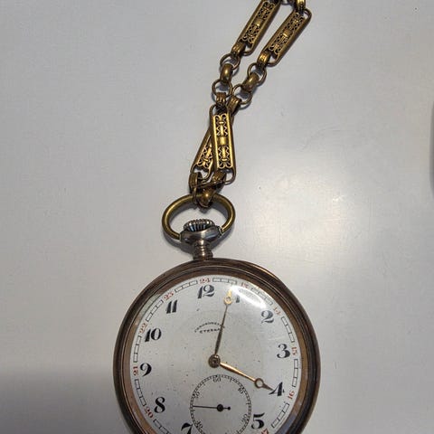 Myydään vanha/antiikkinen mekaaninen taskukello, jossa kaunis koristeltu kellotaulu (roomalaiset numerot, kukkakuvio/guilloché-tyyppinen koriste) ja pieni sekuntitaulu. Kuorissa hienot kaiverrukset. Mukana vetoon tarkoitettu avain (kuvissa näkyvä).
