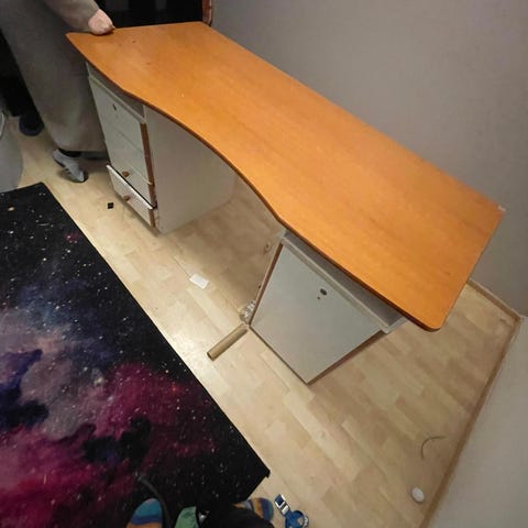Annetaan ikean korkeakiiltoinen työpöytä. Mielestäni yleisilmeeltä siisti, vaikkakin löytyy paljon käytönjälkiä ja laatikot vaativat ruuveja ja säätämistä.