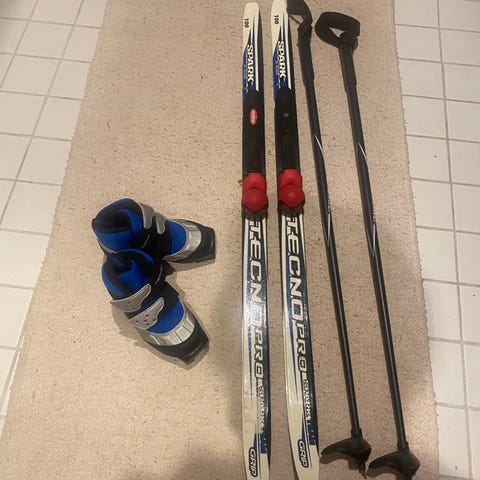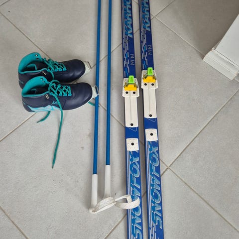Sukset 158 cm, sauvat 115 cm, monot 36. Siteet NNN.