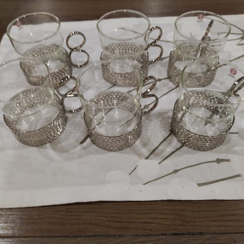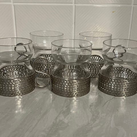 Neljä kappaletta lilan väristä Tsaikka-lasia hopeanvärisellä, ruostumattomasta teräksestä valmistetulla pidikkeellä