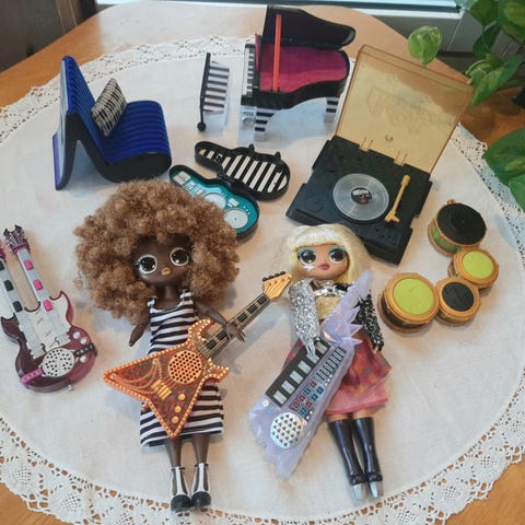 Myydään 4 isoa ja 4 pientä nukkea. Kaikki soittimet toimivat ja niistä kuuluu musiikkia.