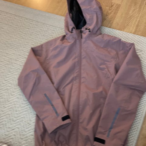 Kuoritakki, hempeän vaaleanpunainen väri. Sisällä mesh-kangasta tuomaan lisää hengittävyyttä, selässä ulkopuolella ilmanvaihtoa varten leikkaus. Näkyy kuvassa. Kaksisuuntainen vetoketju, taskut neppareilla. Hupussa ja vyötäröllä kiristysominaisuus.