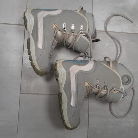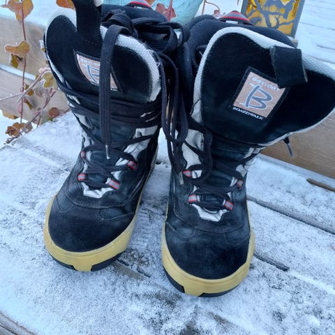 Myydään joitakin kertoja lasketut moitteettomat lumilautakengät.