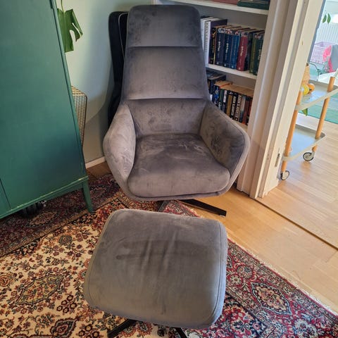 Tyylikäs moderni nojatuoli ja rahi, jotka on verhoiltu beigen sävyisellä kankaalla. Tuolin selkänoja on korkea ja siinä on mukava niskatuki, joka lisää istumismukavuutta. Rahi täydentää kokonaisuuden ja tarjoaa lisämukavuutta jaloille. Kunto on hyvä, mutta kankaassa on havaittavissa vähäistä kulumaa käytön jäljiltä. Yleisilme on kuitenkin siisti ja käyttökelpoinen.