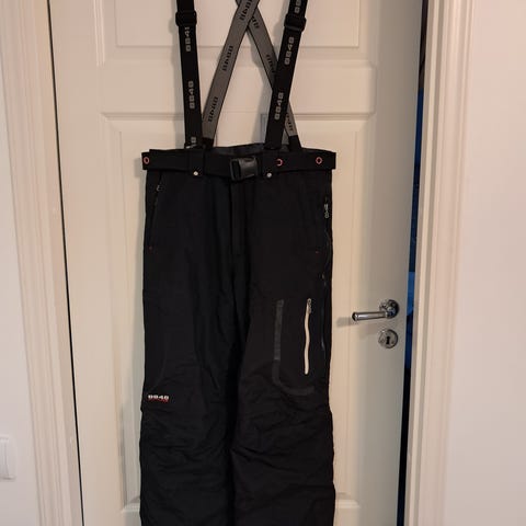 Vetoketjulla avattavat tuuletusaukot lantiolla, irrotettavat henkselit, lahkeensuissa lumilukot, vyö ja kaksi taskua.