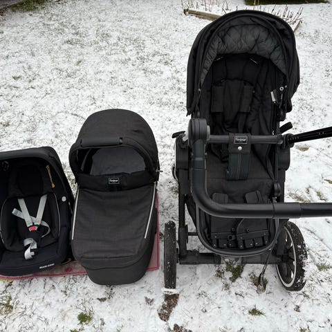 Myydään ensisijaisesti pakettina: yhdistelmävaunut ja turvakaukalo (sekä paljon muuta lisävarustetta)