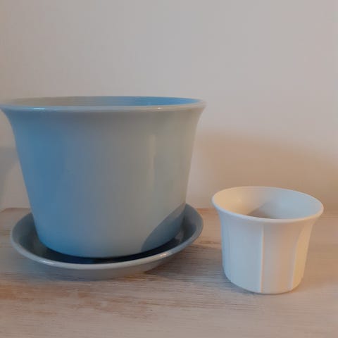 Arabian vanha Kerä kukkaruukku aluslautasineen. Halkaisija 13,5 cm.
