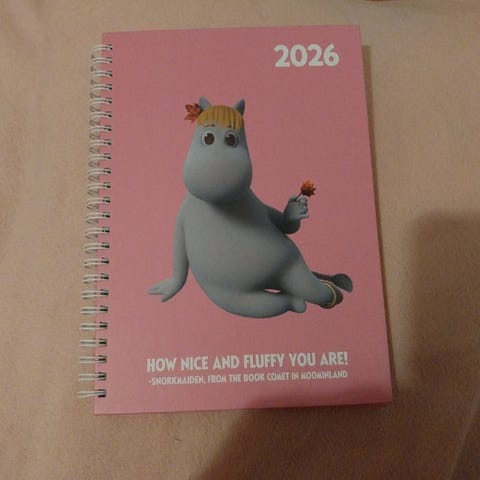 Myyntiin tarpeettomana uusi vaaleanpunainen muumiaiheinen nidottu muistikirja.