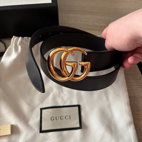 Käyttänyt pari kertaa, pituus 100cm (ensimmäinen soljen reikä ~80cm kohdalla.) soljessa takana pientä kulumaa.