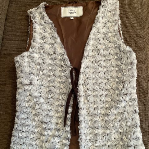 Luonnonvalkoinen tekoturkisliivi koko XS (164 cm). Irrotettava musta vyö tulee mukana. Kunto kuin uusi. Hp. 10 euroa.