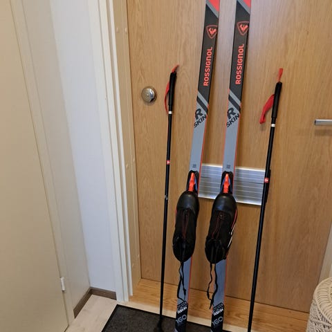 Rossignol Rskin pro karvapohjasukset, Leki PRC 700 -kuitusauvat ja Rossignol classic X-6 monot.