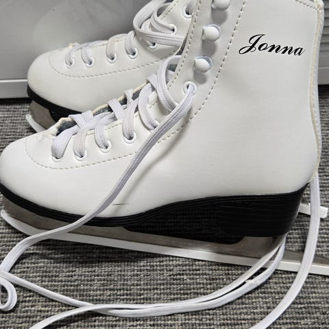 Jonna lasten luistimet, koko 34, valkoinen väri. Ollut yhdellä lapsella yhden talven käytössä. Näkyy hieman käytön jälkiä pinnassa. Lämmin vuori.
