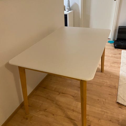 Siisti ja hyväkuntoinen valkoinen ruokapöytä, koko 80x130cm ja korkeus 75cm, tukevat metallijalat. Pieniä käytönjälkiä.