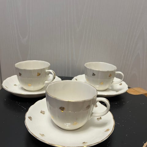 Meripihkan väriset 1970-luvun Verecon Apila-sarjan? lasiset kahvikupit sekä lautaset. Hyvä, käytetty kunto.