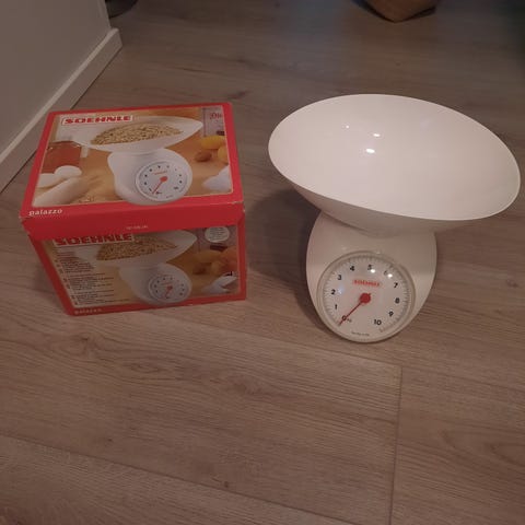 Mekaninen keittiövaaka, jossa on metallinen punnitustaso.