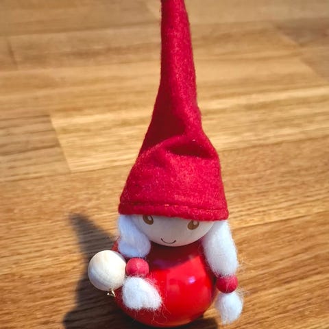 Aarikka Joulu koristeenukke, valmistettu puusta ja kankaasta. Nuken väri on punainen, ja se sopii joulukoristeeksi. Tonttu kultasydän.
