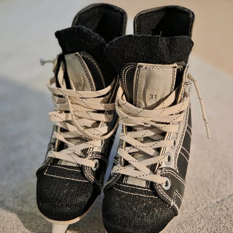 Teroitettiin viime talvena ennen kuin siirtyi nuoremmalle ja luistelukerrat jäi kelien vuoksi ihan pariin ja nyt ei enää mahdu joten terät on käytännössä tuliterät.