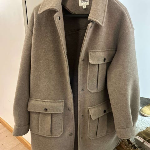 Hupullinen villakangastakki. Väri luonnonvaalea/beige? Hupusta yksi nappi hävinnyt ja osa napeista löyhästi kiinni. Sivutaskut ja kauniit leikkaukset. Koko merkintä S,mutta lienee hieman pienempi. Nyt edullisesti.
