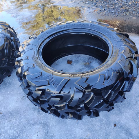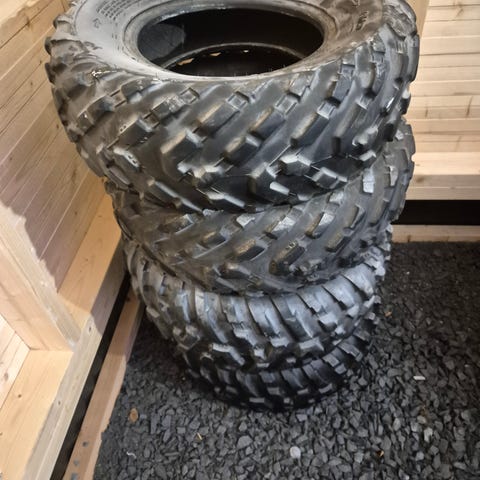 Käytetyt mönkijän renkaat peltivanteilla.