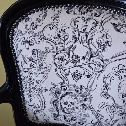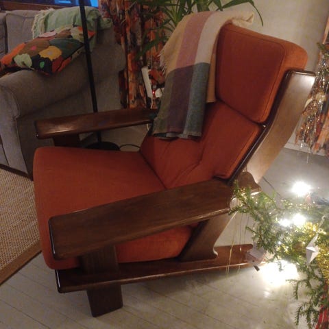 Vintage nojatuoli samettiverhoilulla ja koristeellisella puukehyksellä