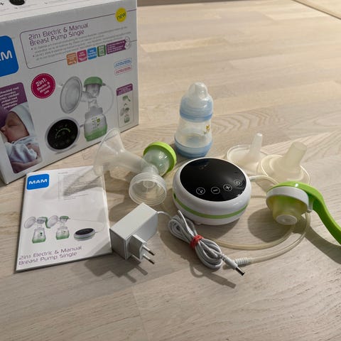Vain pari kertaa käytössä ollut MAM 2in1 Single breast pump jossa sekä sähkö- että manuaalirintapumppu. Manuaalista ei ole edes kokeiltu, samoin molemmat tuttipullot ja keräysastiat käyttämättömät. Puhdistettu ja steriloitu käytön jälkeen ohjeen mukaisesti. Kaikki osat ja ohjekirja tallessa.