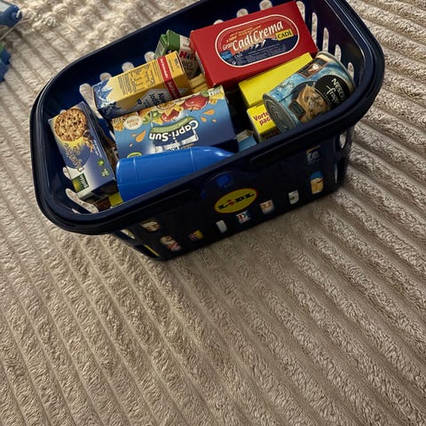 Avaamaton pakkaus, ostoskori, aterimia ym ruoanlaittovälineitä, leikkiruokia jotka voi leikata