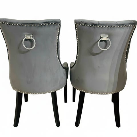 Four dining chairs upholstered in a brown and white patterned fabric. The table is also on sale, but not included in the price of the chairs. 40 € per chair