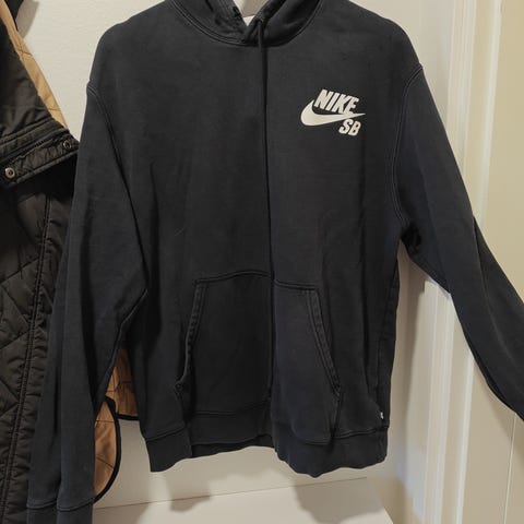 Catmandon musta, oranssilla ompeleilla koristeltu huppari, koko 40, uudenveroinen, 94% polyesteriä ja 6 spandexia, sivutaskut