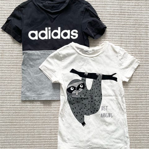 Kappahlin t-paidat 2 kpl. Koko 122/128. Hyvä kuntoiset. Molemmista löysin kuitenkin pienet tahrat. Lehtikuvioisessa todella himmeä/huomaamaton tummempi kohta helmassa. Jätsipaidassa kaksi ruskeaa jälkeä.