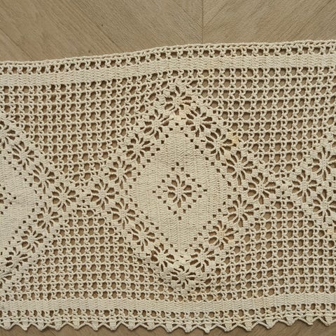 Katso paljon muitakin käsin virkattuja pitsi liinoja ja pitsiverhoja ja yhdistelen mielelläni ostoja jolloin postikulut pienenevät.