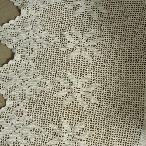 Todella kaunis käsin virkattu pitsi kappa tai verho se on Viti valkoinen ja hyvää puuvilla lankaa. Vähän kiiltävää.