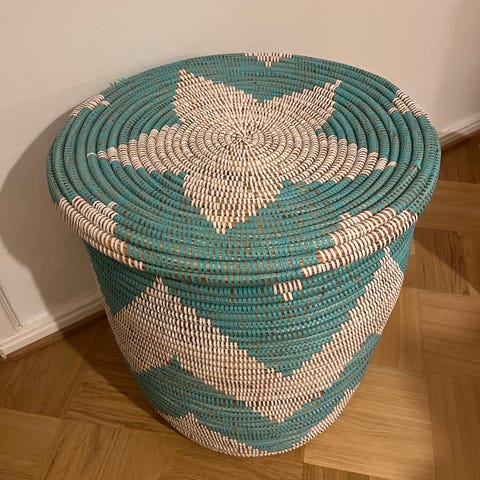 Upea käsintehty kori Senegalista. Sopii yhden hengen taloudessa pyykkikoriksi tai esim. lelujen säilytykseen. Haku Töölöntorilta.