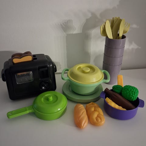 Lasten leikkikaupan leluja, myyntihylly tarvikkeineen, kassahihna, ostoskärrit ja kori. Uudenveroiset. Hyllyn korkeus 28cm eli kunnon vehkeet.