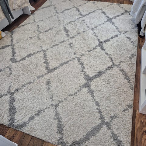 Näyttää kuvissa hiukan raidallisesta, mutta on tasavärinen. Johtunee rullalla säilyttämisestä ennen kuin oikenee kunnolla lattialle.