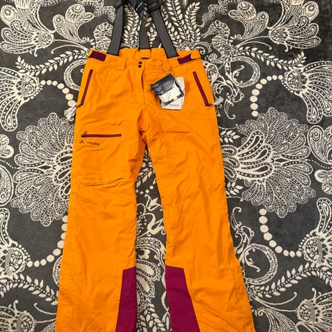 "Marjapuuron" väriset Burton henkselilliset ulkoilu housut, lahkeissa lumipusdit ja vetoketjut. Vettäpitävät.