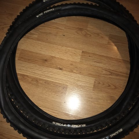 Ollut litkutettuna. Litku on pesty pois, ei kuivuneita litkun jäämiä. Toisesta puuttuu kaksi nastaa. Toisessa kaikki nastat tallella. Muutamia nappuloita paikattu liimalla, kun kivi on rikkonut nappulaa. Toisessa renkaassa tubuless paikka. Paikka pitää myös litkuilla.