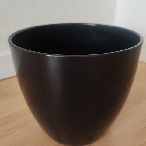 Musta kuukkaruukku. Ruukku on koria ja sisäosa muovia. Jalat käsittelemätöntä puuta. Korkeus 47 cm ja halkaisija 23 cm.