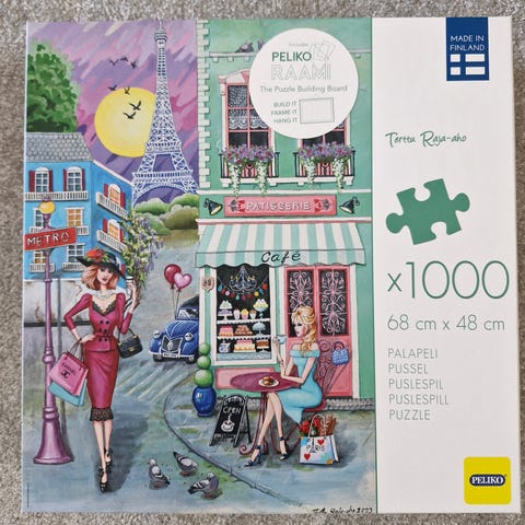 Pelikon palapeli, kerran kasattu. Mukana paperinen Raami - palapelin kokoamisalusta ja tarrat.