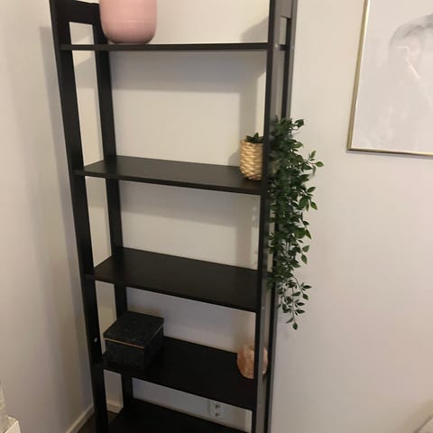Valkoiseksi maalattu hylly. Mahdollisuus kiinnittää sienälle. Kahdessa hyllylaudassa oksanreijät(?).