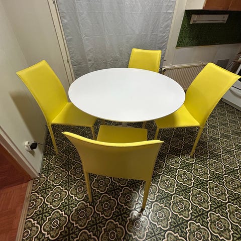 Hyvässä kunnossa oleva RINGSTED Ø100 pöytä musta + 3 kpl KLARUP tuoli musta. Pientä käytön jälkeä.