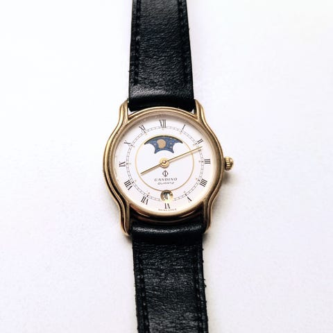 Kellossa on kultainen kotelo, valkoinen kellotaulu sekä musta nahkaranneke.