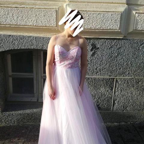 Kerran tanssittu vanhojentanssimekko. Väri harmaa, timantteja yläosassa. Koko 42, mutta rinnan ja kylkien kohdalta pienennetty tikkaamalla. Tikkaukset saa purettua pois. Vyötärönympärys noin 80cm, rintojen ympärys 90cm.
