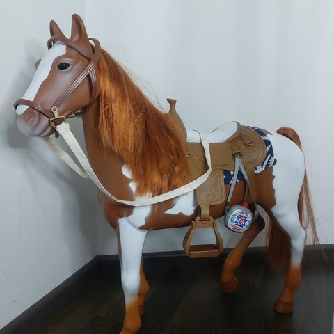 Myydään jaloillaan seisova leikkihevonen lapselle. Säkäkorkeus 43cm. Korvasta painettaessa kuuluu kavioiden kopsetta ja hirnuntaa. Nouto.