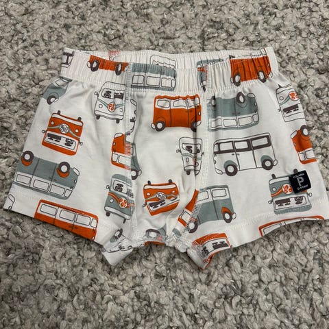 Hyväkuntoiset, ehjät ja puhtaat bokserit. Kuminauhat napakat. Melko pientä kokoa, pysyy hyvin jalassa hoikalla lapsella.