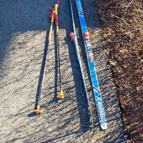 Muutamat sukset 140-150cm, kahdet pienet sauvat.