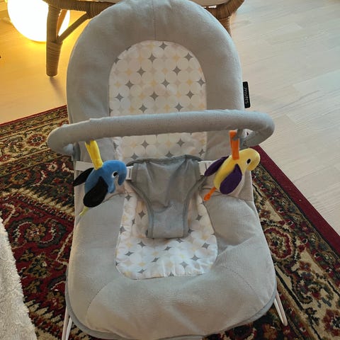 Babybjörn sitteri aktiivisuuslelulla. Tuolissa on pehmeä, pestävä kangaspäällinen ja tukeva metallirunko. Tuoli tarjoaa mukavan ja turvallisen paikan vauvalle istua ja rentoutua. Helppo puhdistaa ja kevyt siirtää kodin eri tiloihin.