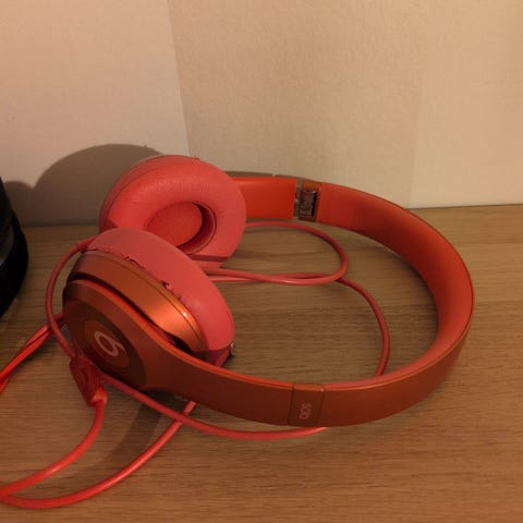 Myyn kuvien mukaiset vuosia varastossa olleet päällisin puolin hyväkuntoiset punaiset Beats Solo langalliset kuulokkeet. Mukana tulee kantokotelo, jossa on Beats-logo. Näissä ei ole langatonta ominaisuutta. Testatessa oikean korvan kuulokkeesta ei tullut ääntä joten myydään korjattavaksi.