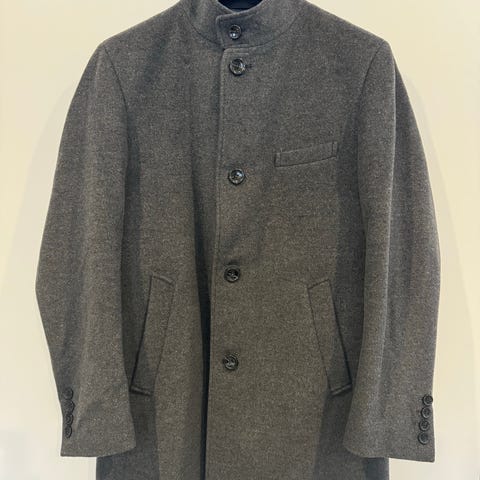 Villakangastakki: pituus niskasaumasta helmaan 98 cm, leveys hartiasta hartiaan 46 cm. Kiinnitys 3 napilla, takana halkio. Kaksi povitaskua (oikea ja vasen), ehjät. Kaksi sivutaskua, ehjät. Satiinivuori, 100% villaa, made in Italy. Uudenveroinen, ehjä, ei hajuja.