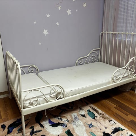 Hyväkuntoinen Ikean Minnen jatkettava juniorisänky. Tällä hetkellä purettuna osiin. Mukaan tulee sälepohja, mutta ei patjaa.